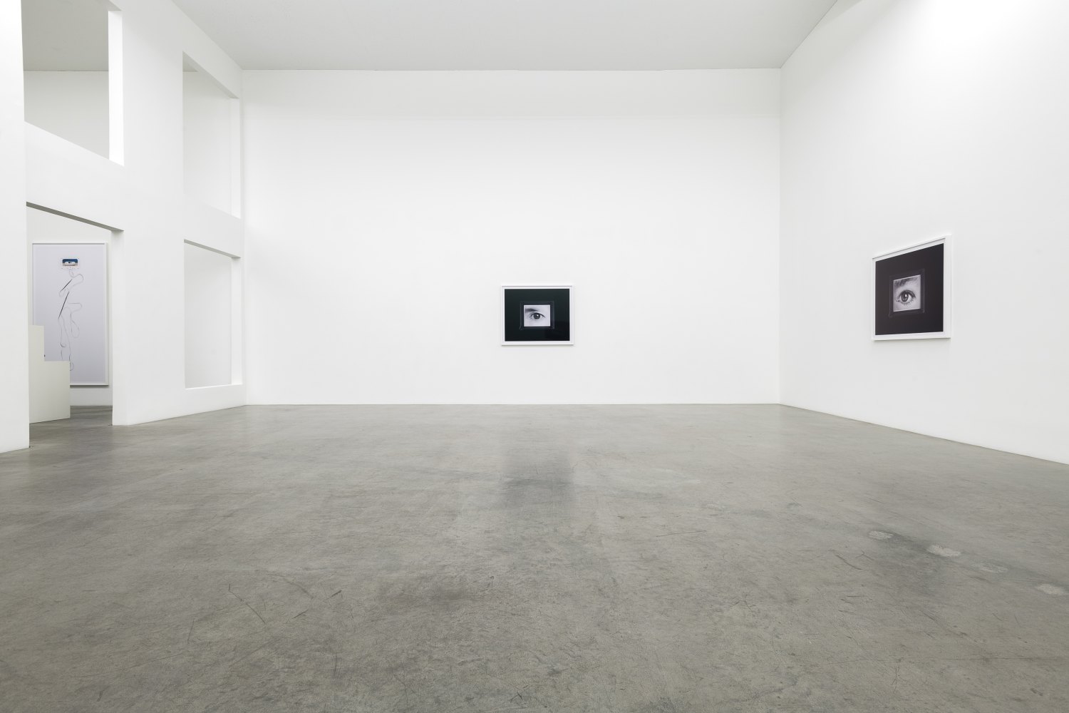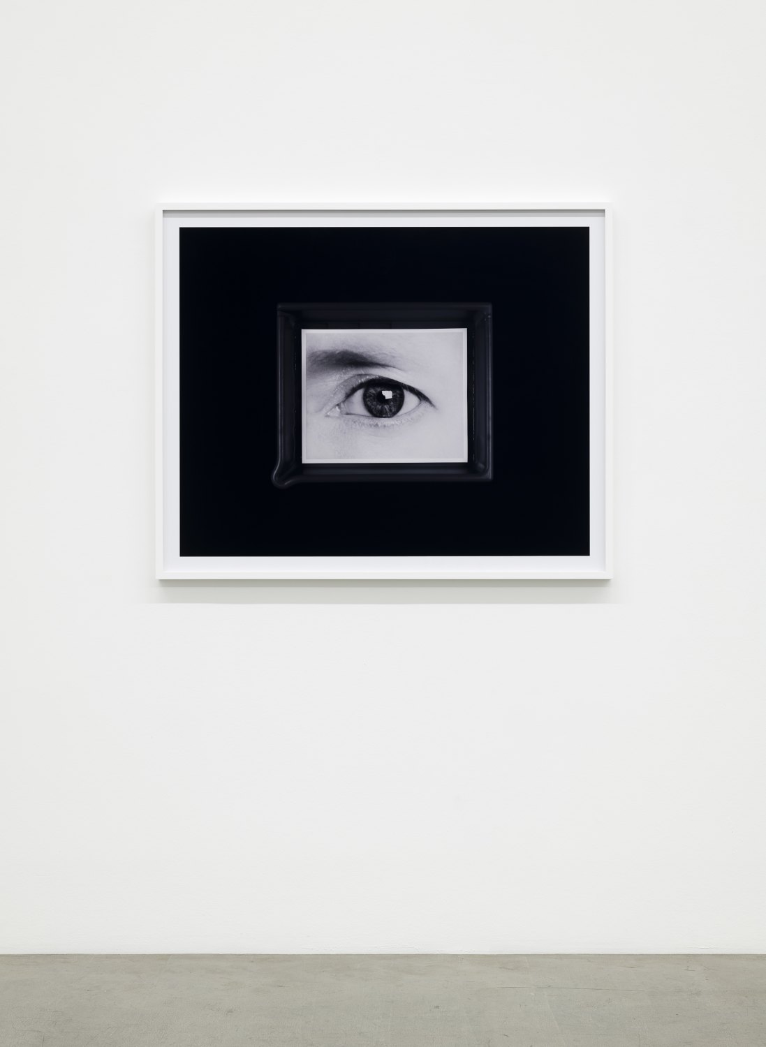 Each subject is represented through a black-and-white photographic print depicting a close- up of their left eye, clearly reflecting a studio scenario in their pupil, which is suspended –framed– in a grey developing tray and recorded in the studio against a monochromatic black background. Images of a blank sheet of photographic paper pose as punctuation to the scape of portraits, insinuating a potentiality of the analogue developing process, in which a latent image becomes visible.
